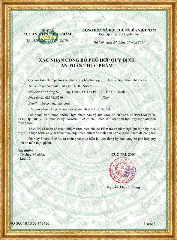 Lưu ý: Chứng nhận FDA Hoa Kỳ của thực phẩm bảo vệ sức khỏe hỗ trợ phát triển chiều cao NuBest Tall đã được hợp pháp hóa lãnh sự (Consular legalization) để xác minh tài liệu trước khi được gửi về Việt Nam để nộp lên cho cơ quan chịu trách nhiệm quản lý tại Việt Nam.